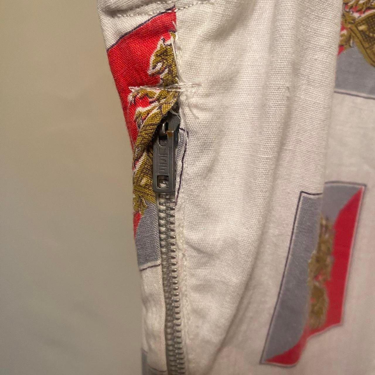 50s/60s vintage red, yellow and white ornate crest novelty print a-line sleeveless mini dress