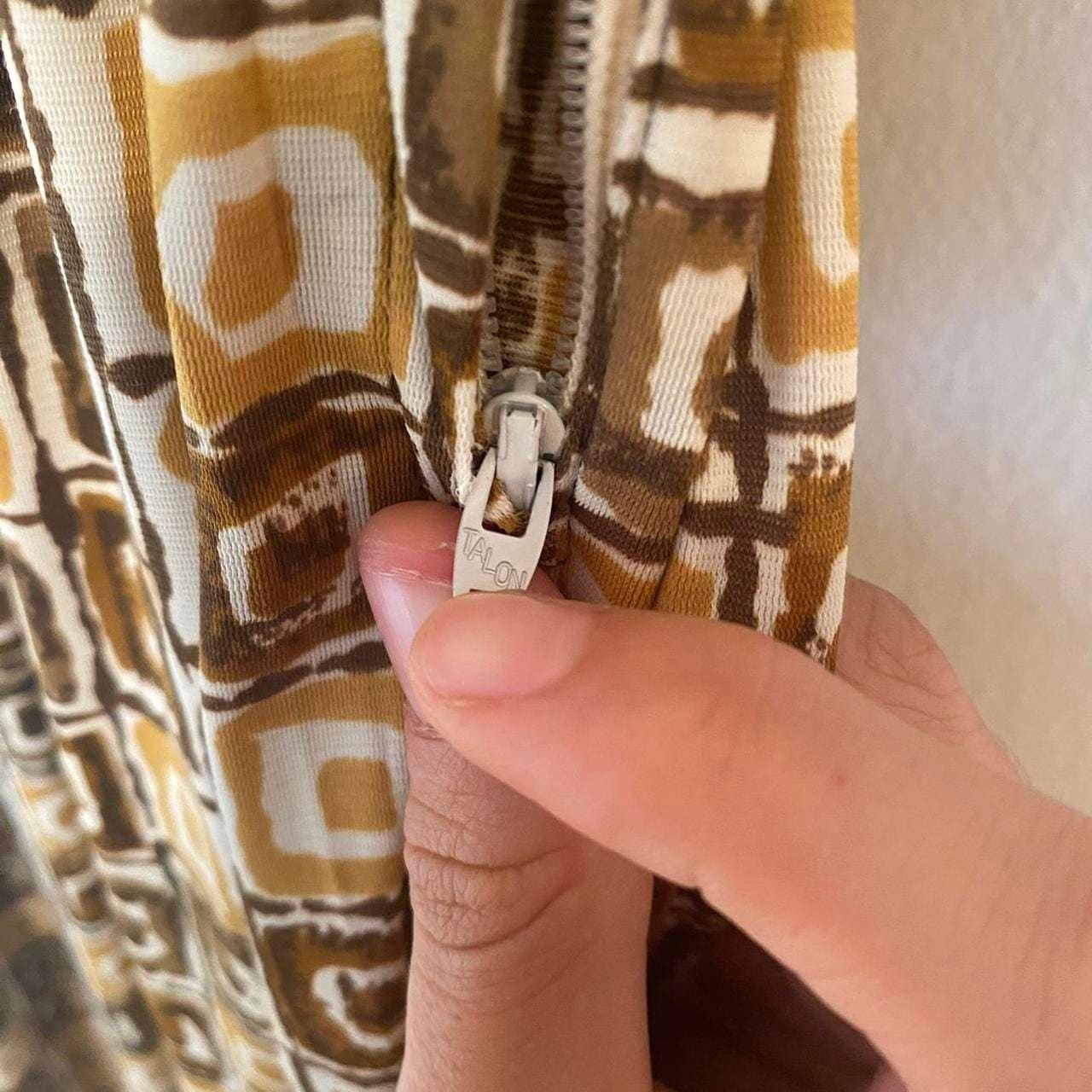 1950s nylon yellow and brown geometric square patterned fit and flare dress